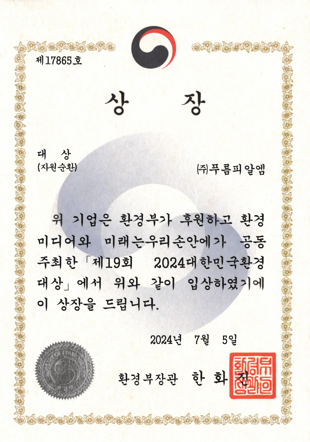 각종 재활용 기술에 대한 끊임없는 연구개발로 업계를 선도하고 있는 ㈜푸름피알엠(대표 정필성)이 지난달 5일 서울 상암동 중소기업 DMC타워에서 개최된 ‘제19회 2024 대한민국환경대상’에서 자원순환부문 환경부장관상을 수상하는 영예를 안았다.