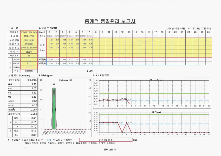 ㈜플러스도어는 KS인증을 준비하면서 동시에 통계적 품질관리를 시작하였다. 이로 인해 지금은 모든 품질의 항목은 데이터화하여 관리가 되고 있으며, 공정을 더 세분화되어 품질의 향상과 업무의 효율성을 더 발전시키려 노력하고 있다.