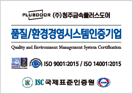 플러스도어는 이로서 ISO9001,ISO14001과 KS인증을 취득한 기업이 되었고, 현재 고효율기자재 인증을 준비 중이다.
