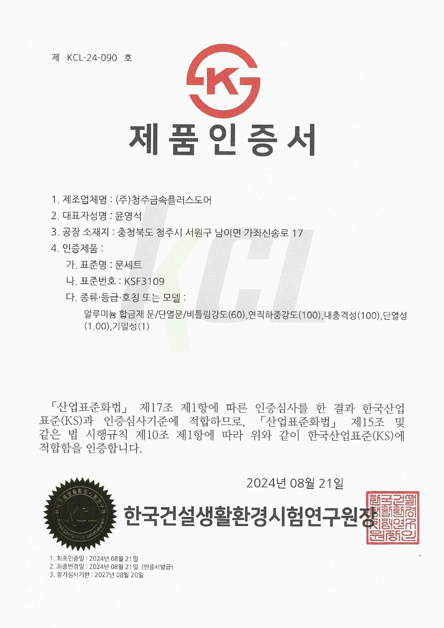 주변에 경험 있던 지인 분들이 도움을 주시고 시행착오를 거쳐 드디어 지난 2024년 8월 21일 KS인증을 취득하였다. 단열현관문 업계에서 KS인증을 받은 사례는 극히 드물다. 그 수많은 업체 중 KS인증을 받은 업체는 현재 두 곳 정도이고, 그 중 하나가 플러스도어이다.